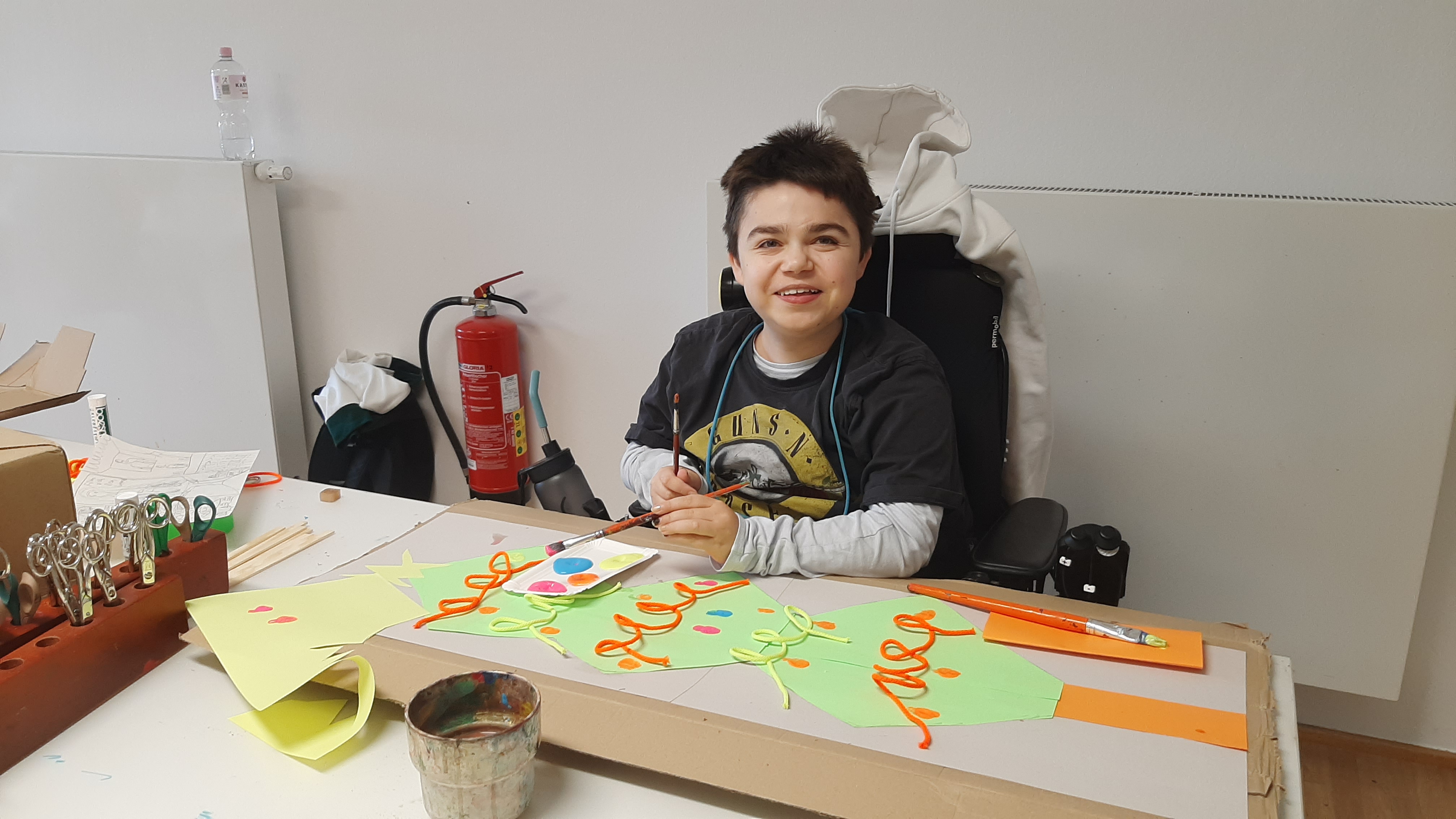 Beim letzten Treffen haben wir uns alle schwarze Kleidung angezogen, damit die Kleidung auf dem Film nicht erscheint. Unsere bunten Neongemälde wurden dann mit Schwarzlicht ausgeleuchtet und gefilmt. Die Rollifahrer hatten während der Aufführung Neonstreifen auf den Rädern und auf den Armen. Zuletzt hat Susanne das Video geschnitten und mit unseren Geräuschen und unseren Kommentaren vertont. Es ist ein richtig toller Film entstanden, der von unseren Träumen und Zukunftswünschen handelt.